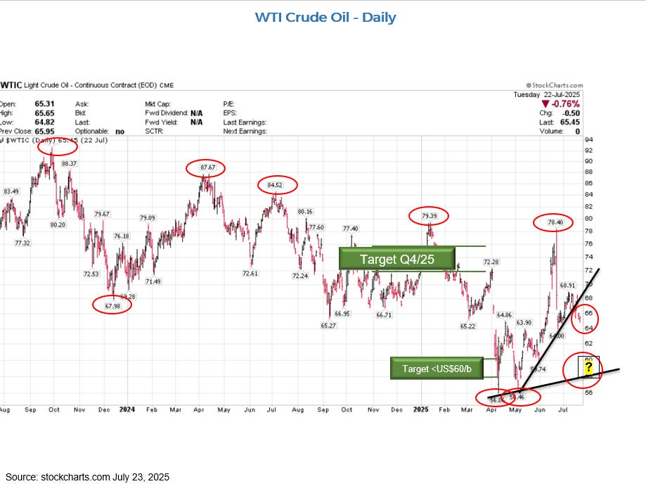 The Trump tariffs are just being seen this month and will be more readily apparent in the stores over the next few months as the tariff levels are firmed up. Both Walmart and Target have warned of the cost of new inventory and much higher prices. Some economists see tariff prices impacting households by US$2,800 by year end. Just think about the cost of clothing, cereals and berries as easy items to see the tariff price impacts. China is now feeling the tariffs and weaker exports of products, hurting energy demand.