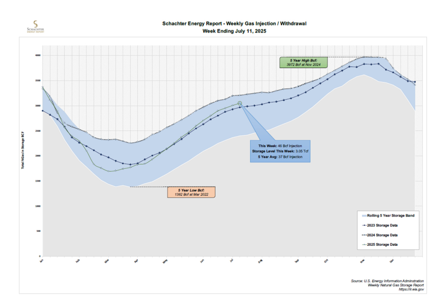 Here is a new chart we developed to show you the ranges of storage over the five year period and how inventories build during the spring and summer into November and then decrease as strong winter demand empties storage as well as consumes current production. We do not believe the US will see storage peak at the 3.97 Tcf level seen in 2024. With increasing demand starting in November and no new storage, quicker withdrawals can be expected this upcoming winter.